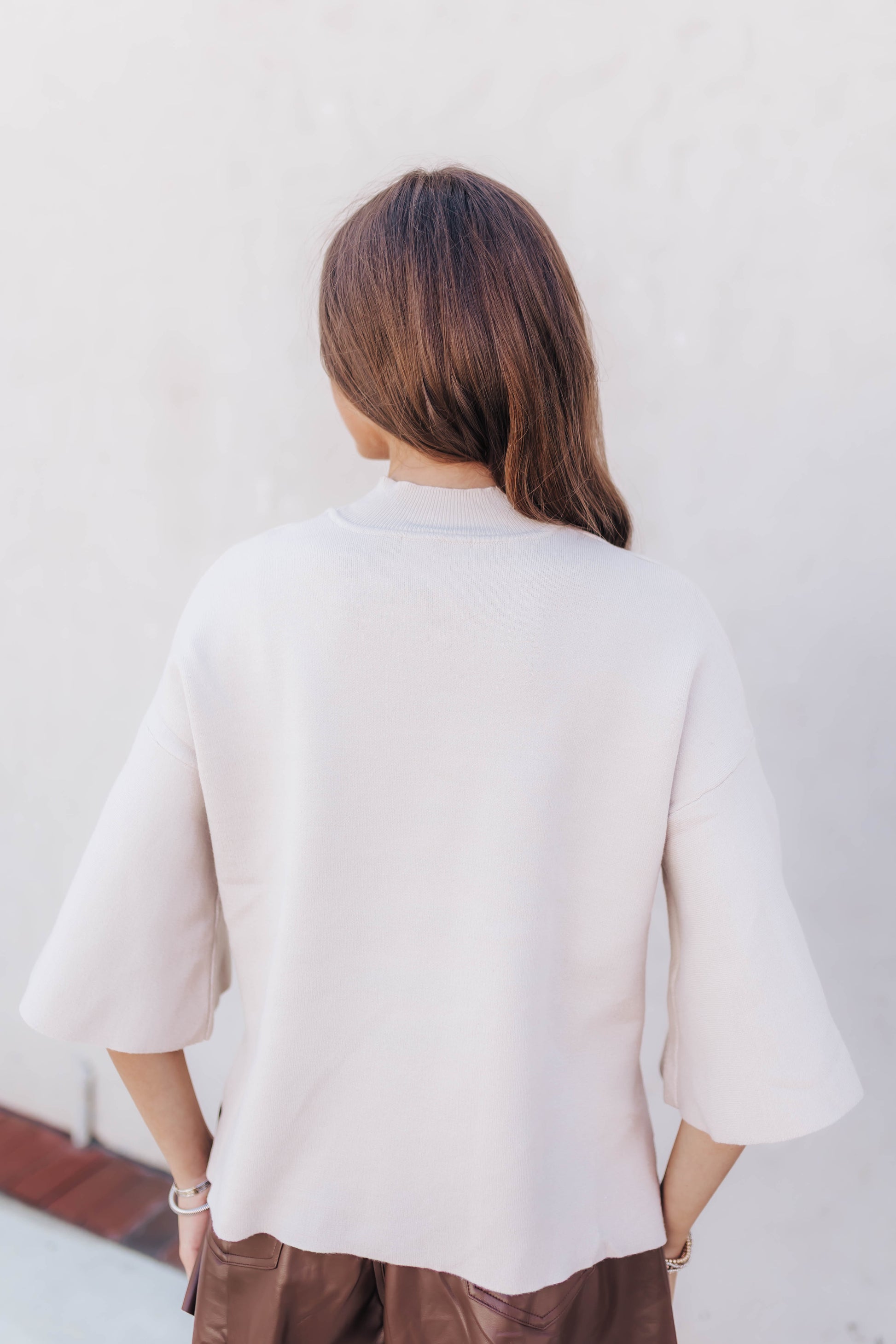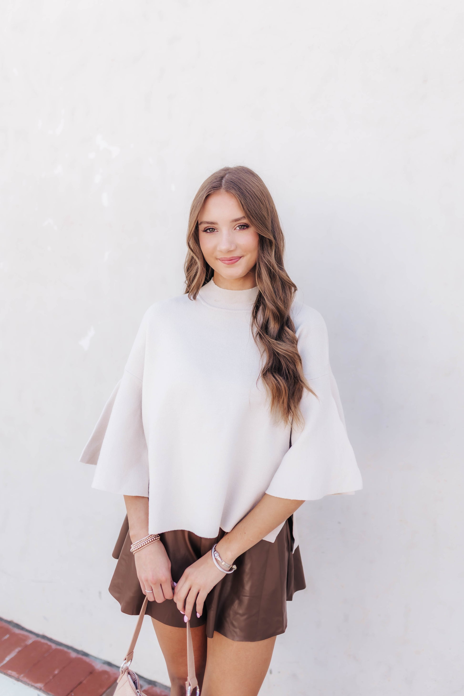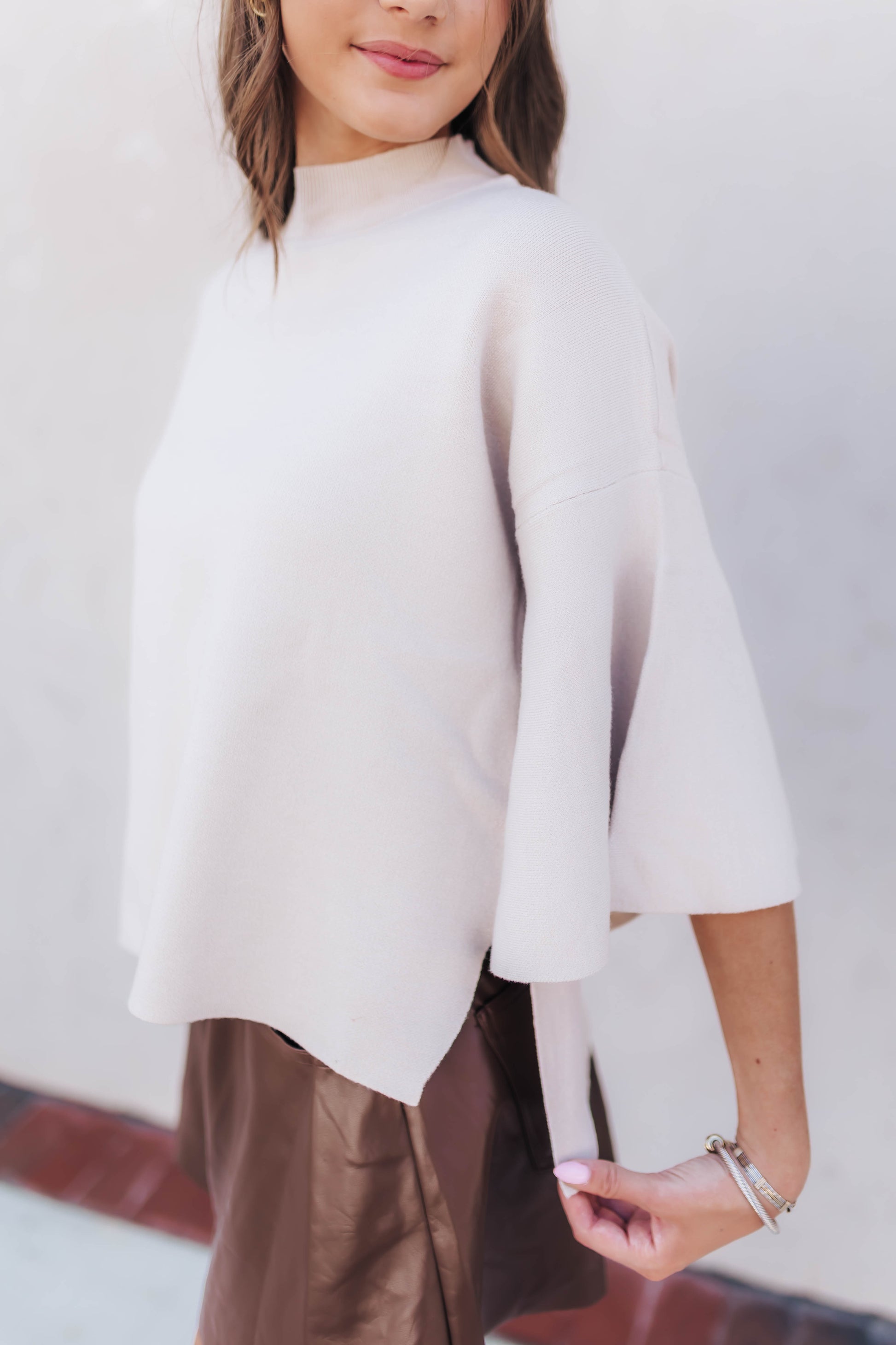 Our Autumn Ivory Sweater Top features a soft high-low hem and graceful bell sleeves. Designed with a ribbed neckline and subtle side slits, it’s a versatile piece you can style countless ways—from casual days to dressed-up evenings.