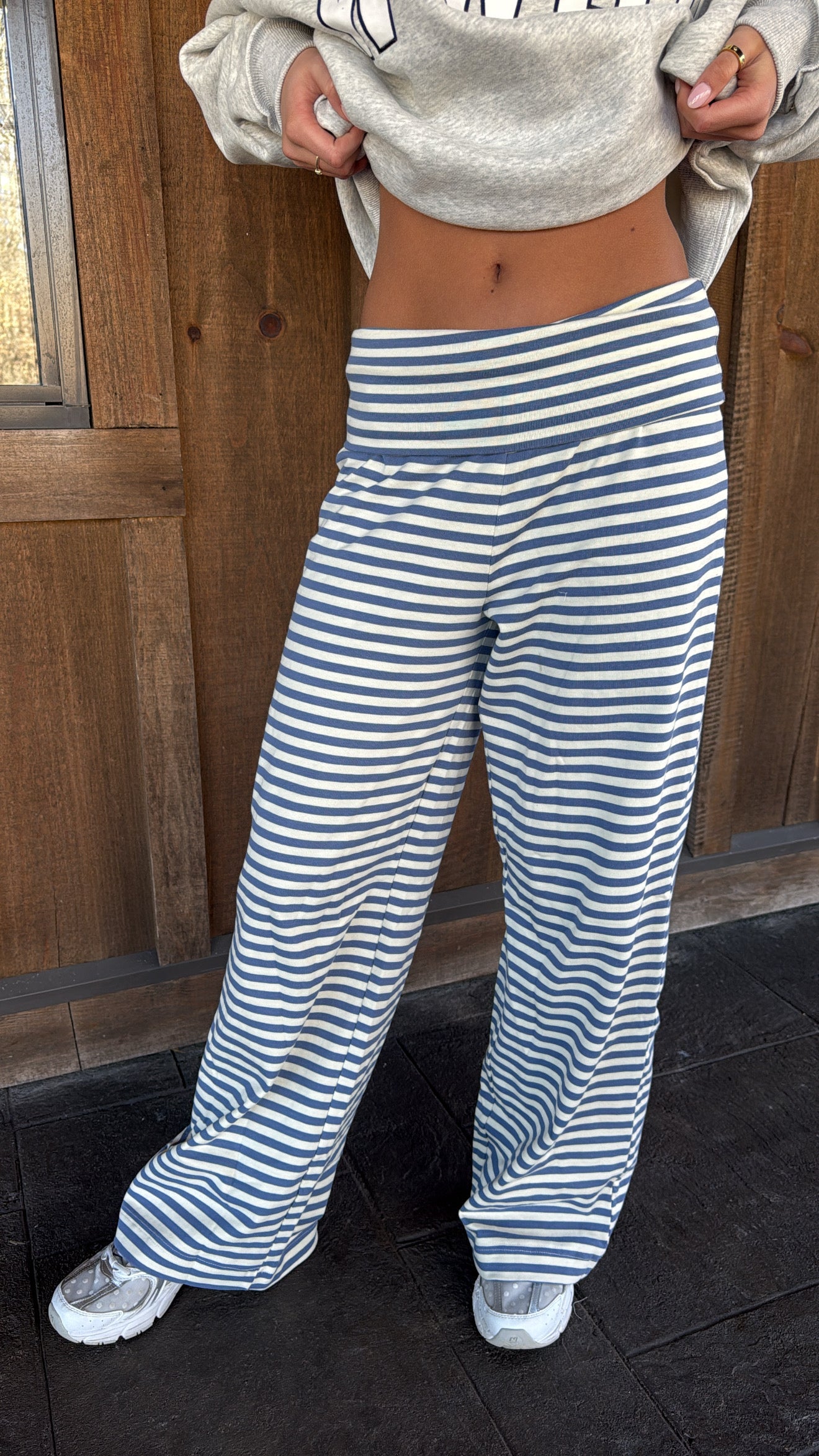 Effortlessly chic and comfy. These blue and ivory striped pants feature a trendy fold-over waistband for a flattering, relaxed fit and a single back pocket for a subtle, stylish detail. Perfect for lounging, running errands, or styling with your favorite tops for a casual-chic look.
