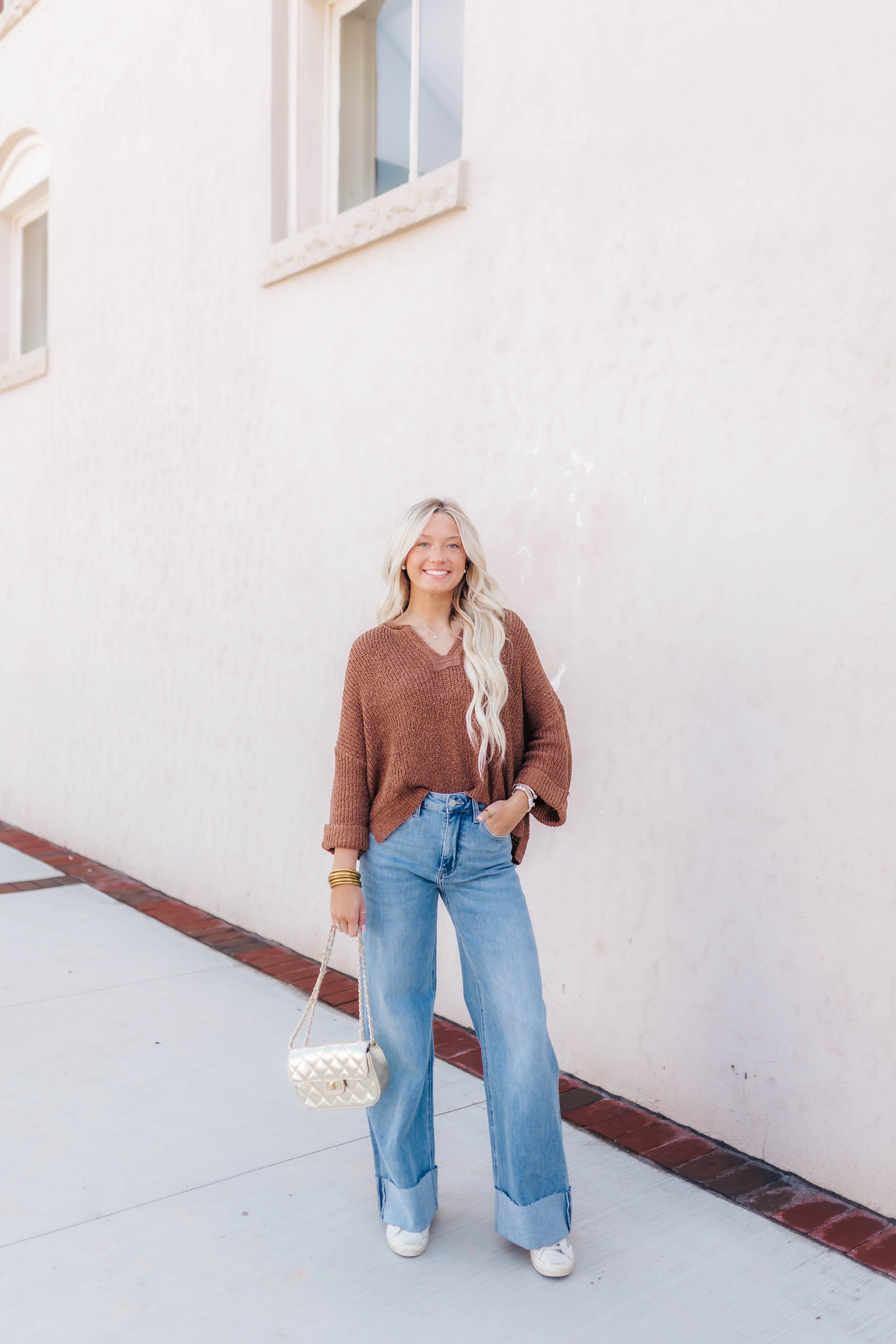 Our harvest camel knit top features a front V-slit neckline, patch-folded sleeves, and side slits in a relaxed pullover silhouette. The loose fit and rich camel hue make it an effortless, cozy layer for crisp fall days.