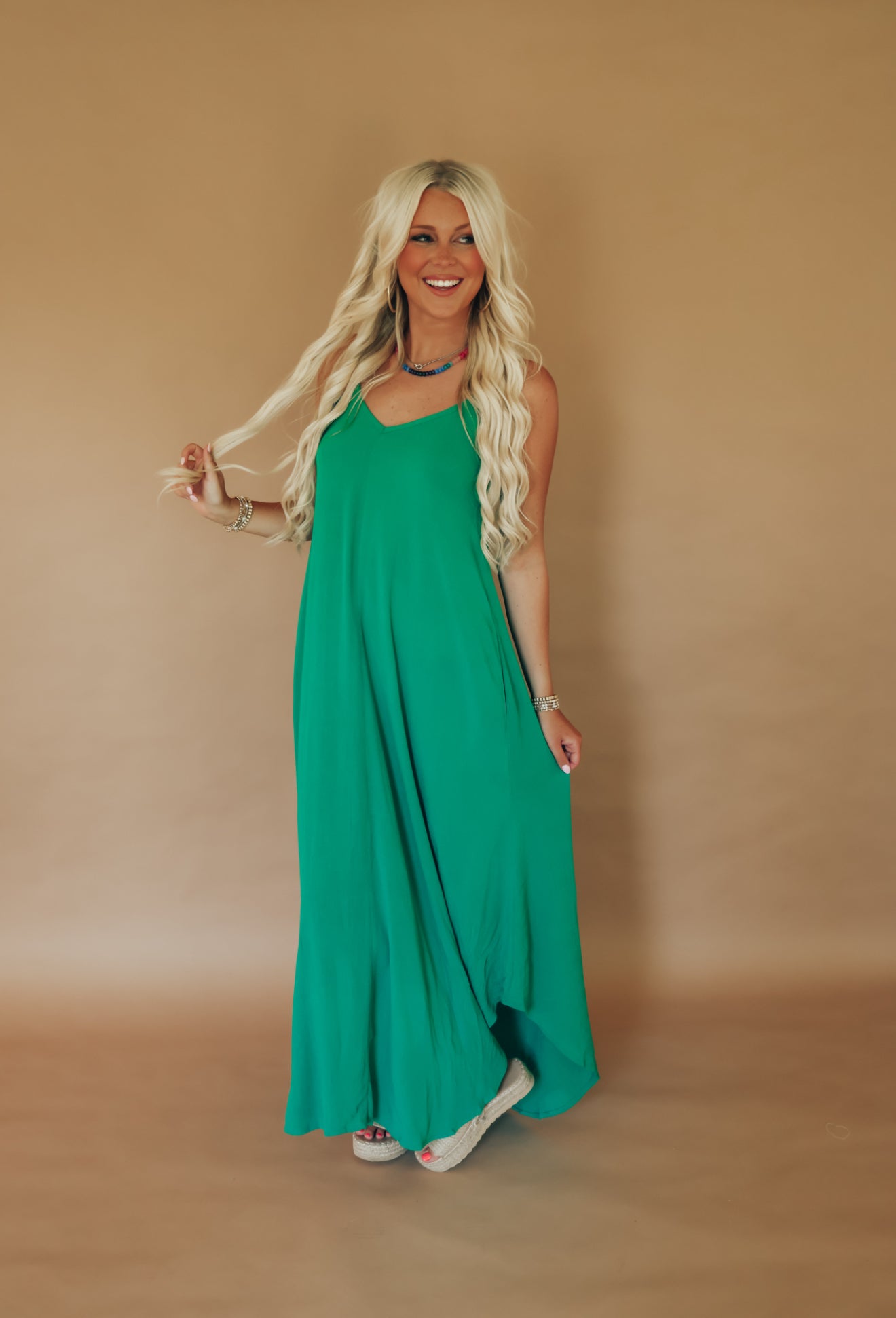 Effortlessly chic and perfect for warm-weather days, this Kelly green maxi dress features a flattering V-neckline and breezy cami-style straps. Crafted from lightweight 100% rayon with a soft woven crinkle texture, it drapes beautifully for an easy, flowy silhouette. Side pockets add a touch of everyday practicality without compromising style. Whether you're heading to brunch, the beach, or a casual evening out, this dress is your go-to for vibrant, laid-back look.