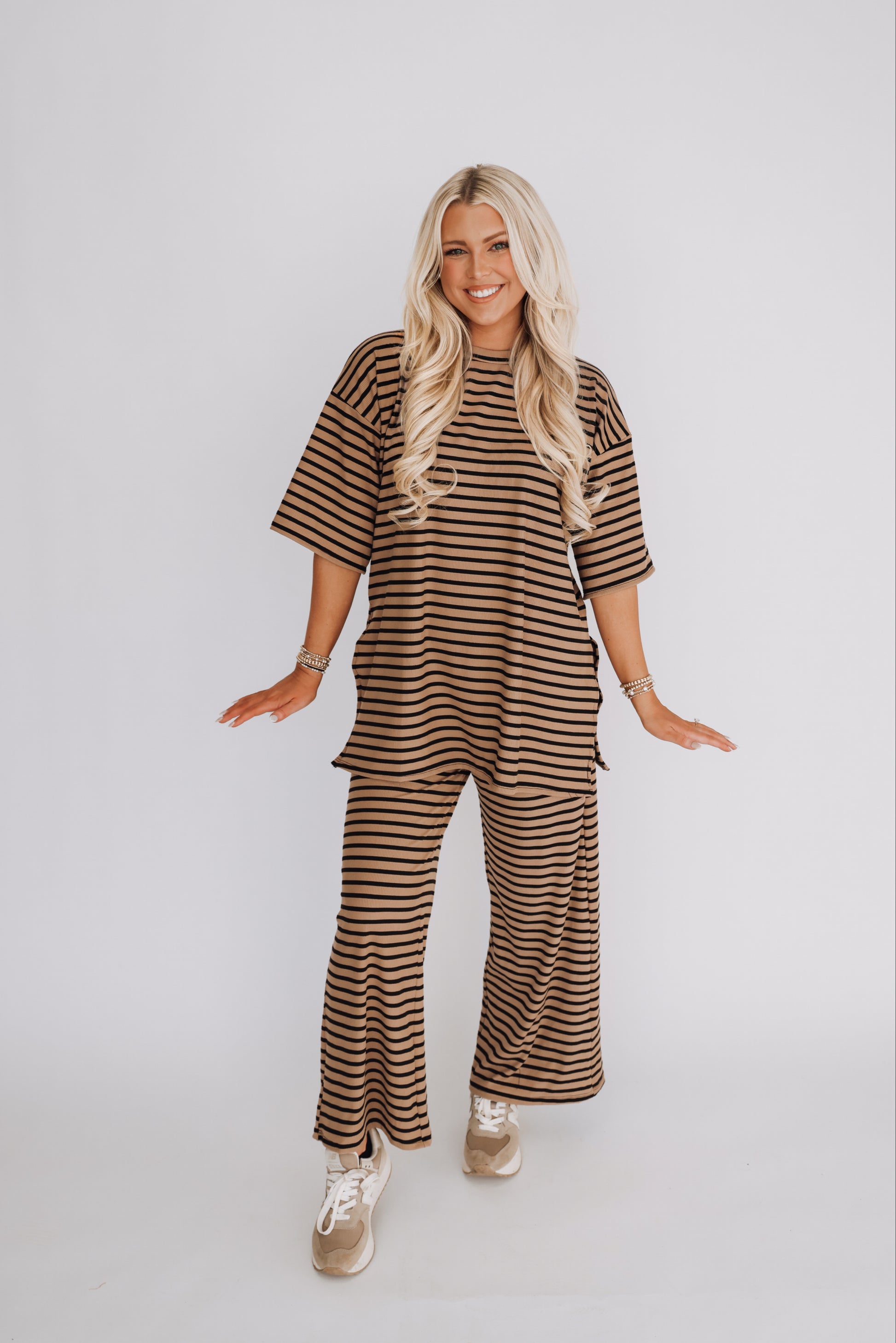 Elevate your everyday comfort with this ribbed stripe set, featuring ankle-length pants and a matching half-sleeve tunic top. The tunic is designed with side slits and a relaxed, flowy fit for easy movement and a flattering drape. Coordinated with wide-leg, ankle-length pants, this set delivers effortless style with minimal effort. Crafted from soft, stretchy fabric with classic horizontal stripes, it offers the perfect balance of comfort and modern simplicity, ideal for lounging, errands, or casual days out.