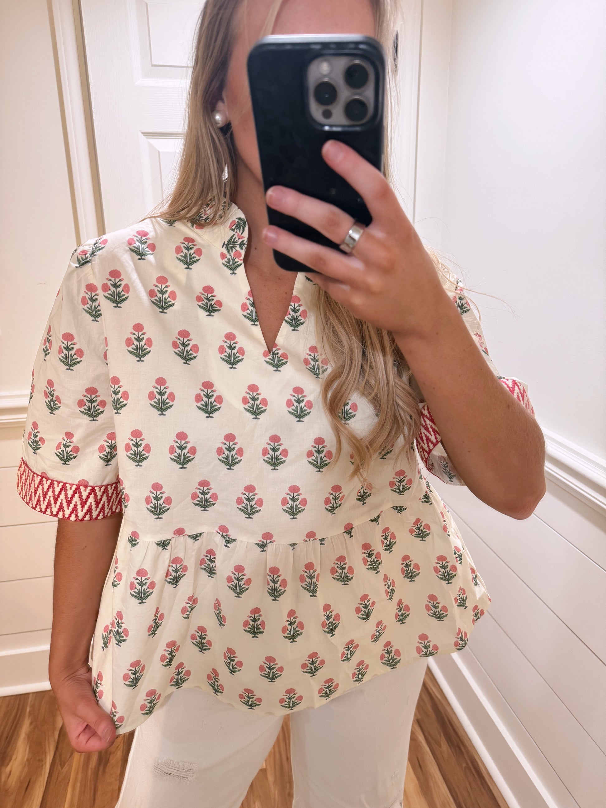 Half sleeve woven print top featuring a soft floral pattern on a cream base and contrast trim detail at the sleeve hem. Designed with a relaxed fit, subtle peplum shape, and notched neckline for an easy, flattering look.