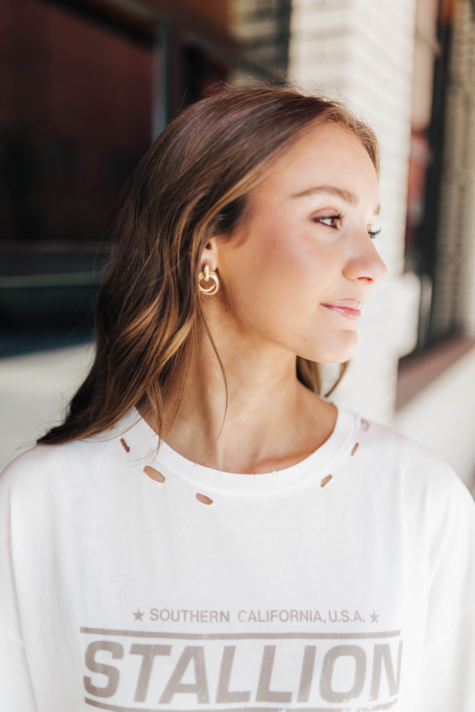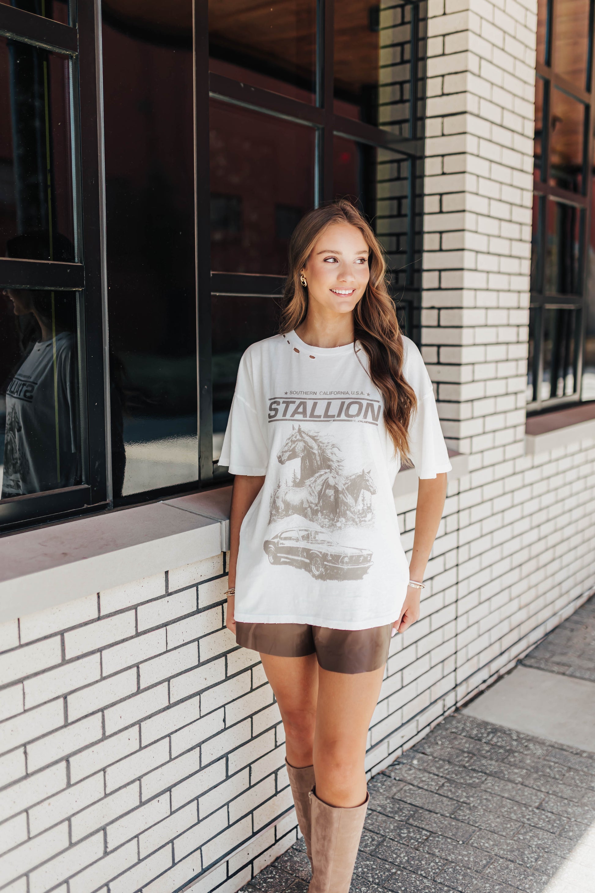 Slip into laid-back retro vibes with this garment-washed white tee, featuring a faded classic-car-and-horse graphic for that perfectly timeworn look. Designed with a round neckline, short sleeves, and an easy drop-shoulder fit, it’s finished with raw, torn distressing at the neckline, cuffs, and hem for authentic edge. The oversized silhouette makes it an effortless throw-on with denim, cutoffs, or layered under a jacket for a cool, lived-in feel.